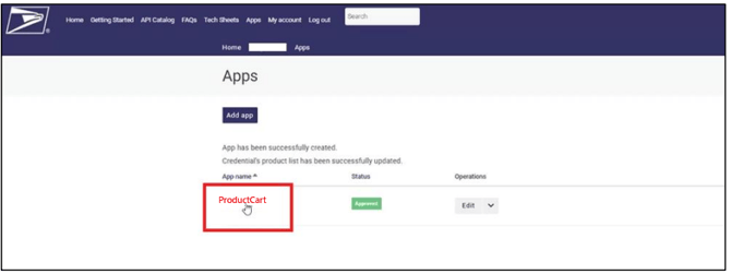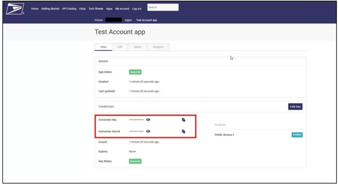 To retrieve your credentials consisting of a Consumer Key and Consumer Secret needed to access USPS APIs, select your App on the USPS Developer Portal Apps landing page.