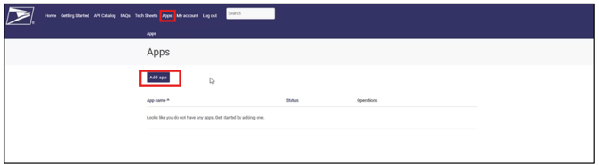 Once logged into the USPS Developer Portal, to create an App click on “Apps” in the top banner and then click “Add App.”